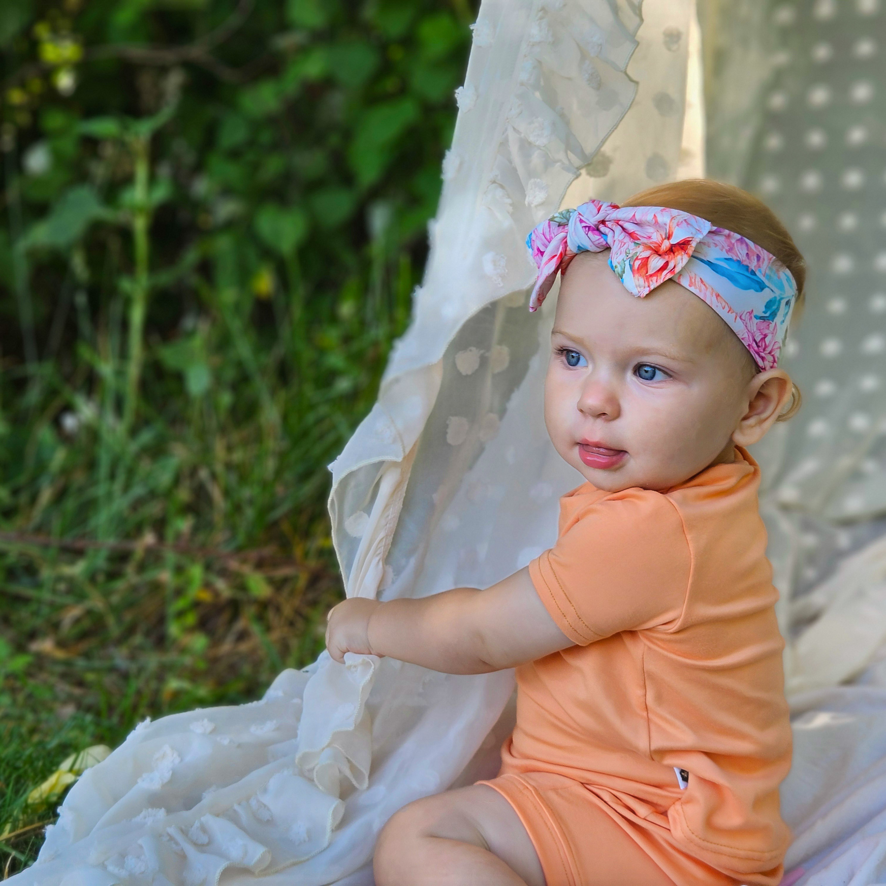 This comfortable and stylish outfit is designed to easily step into and pull up or pull the top on over the head and then put the feet in through the waist opening. A stretchy back waistband holds the shorts gently around the waist while providing coverage under the back of the top.