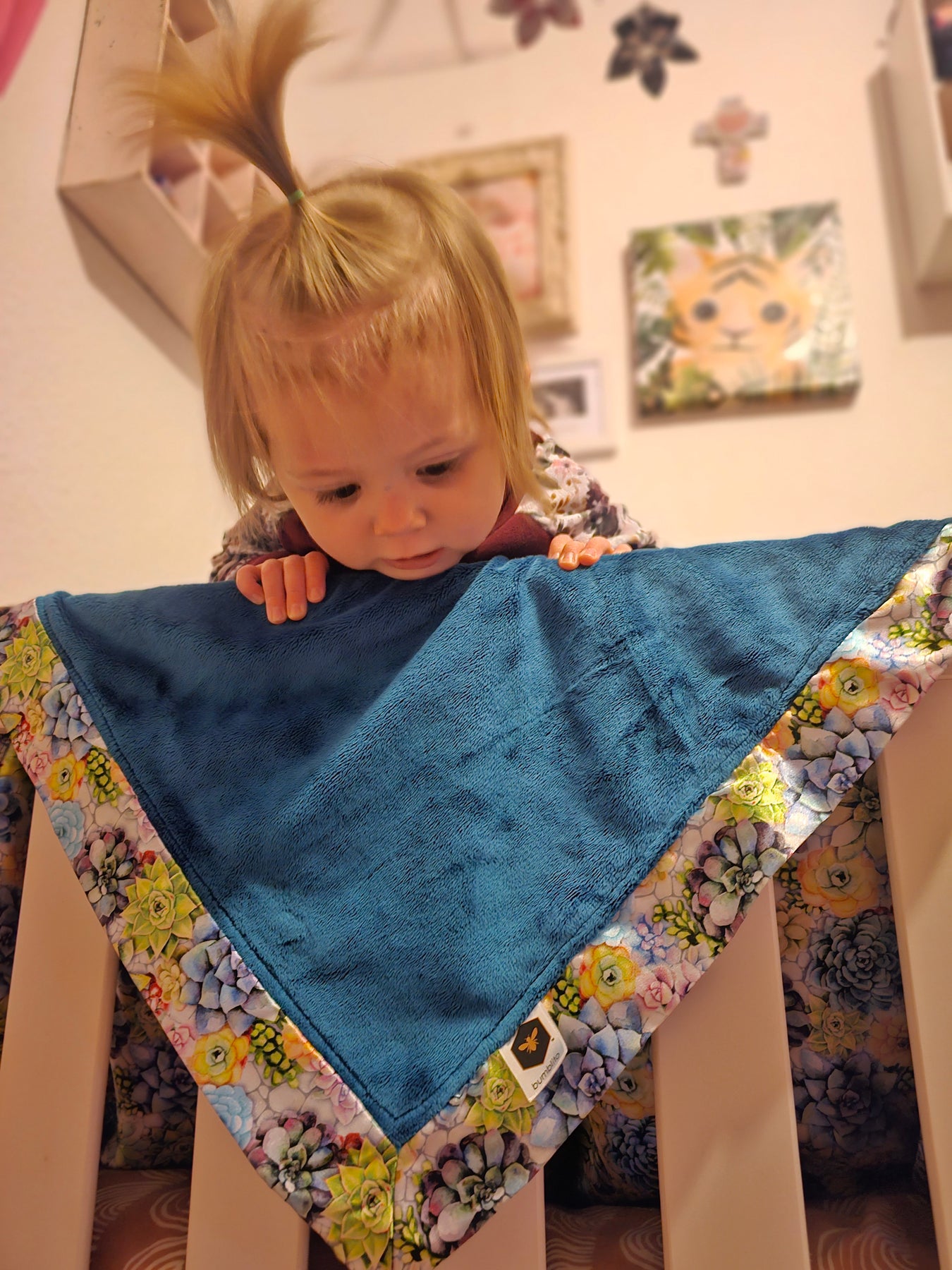 Our Luxe blankets have a plush minky side and a smooth satin back and binding. Keep the satin back against your skin on warmer nights to stay comfortable while sleeping, and keep the plush minky side against your skin on cold winter nights to stay warm. These blankets come in two sizes; the Baby Bee Luxe which is 40” x 50" and the Bee Luxe which is 50”x60”. Our luxury blankets are proudly manufactured in the USA.