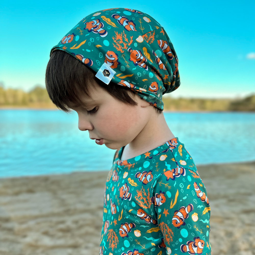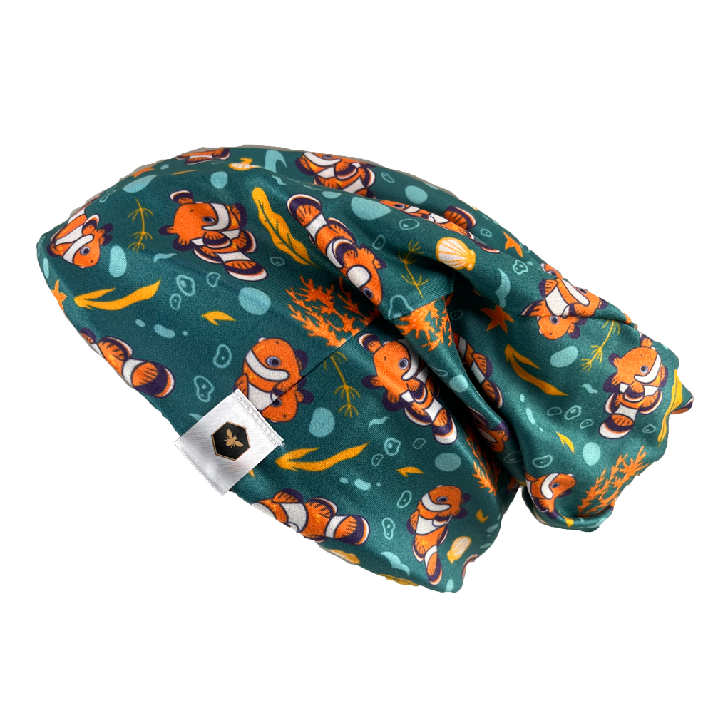 Beanies may be machine dried on low or medium heat with like fabrics. Washing or drying with rough fabrics or velcro items may cause snags or pulls.