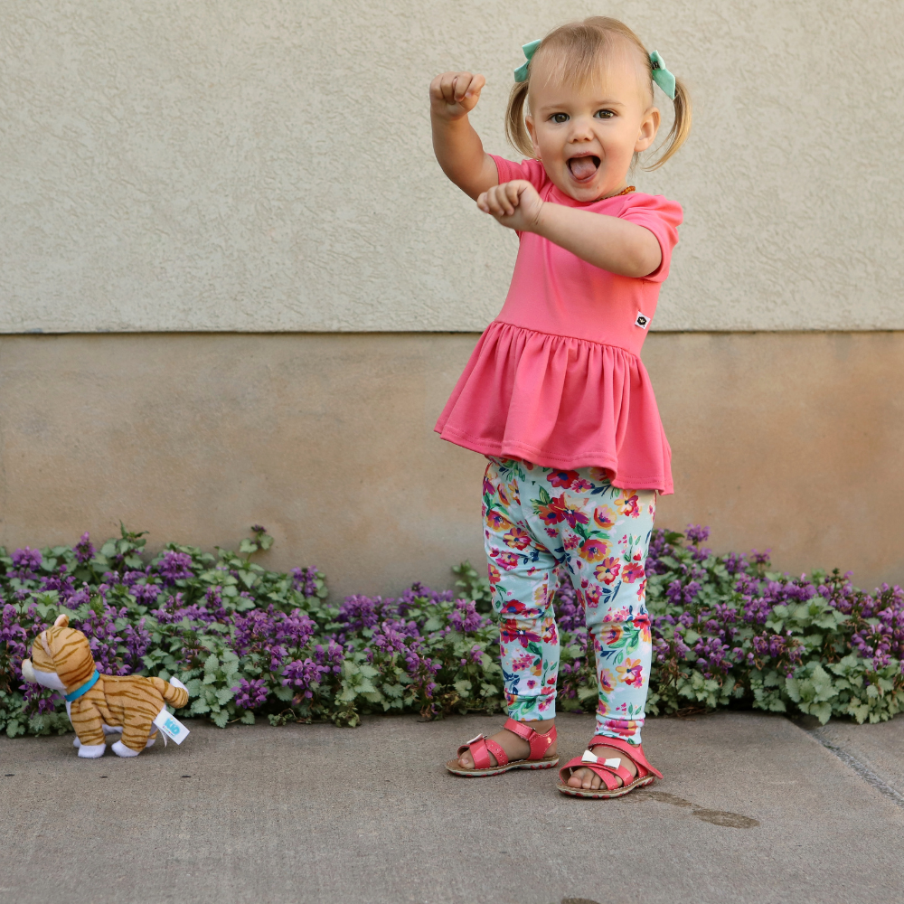 This top features a vibrant print, or solid, on our buttery soft & stretchy polyester, which provides comfort but also holds up to toddler play and washing. With this flowy top, even the most active little ones will be able to move and grow comfortably in their new favorite peplum!