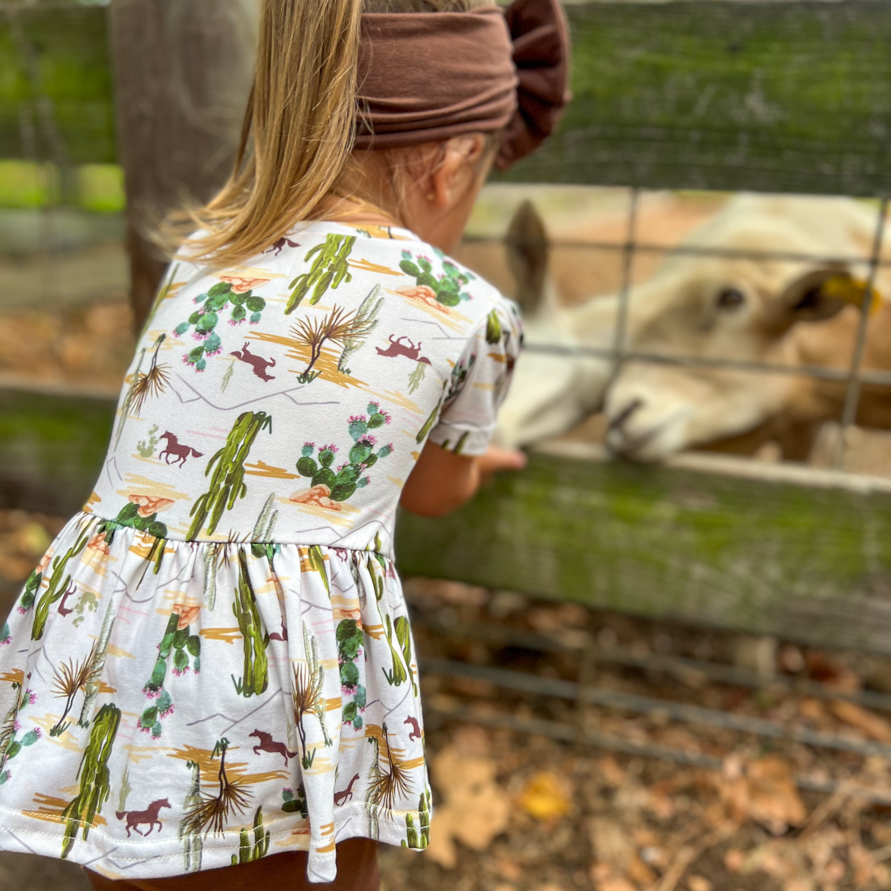 This top features a vibrant print, or solid, on our buttery soft & stretchy polyester, which provides comfort but also holds up to toddler play and washing. With this flowy top, even the most active little ones will be able to move and grow comfortably in their new favorite peplum!