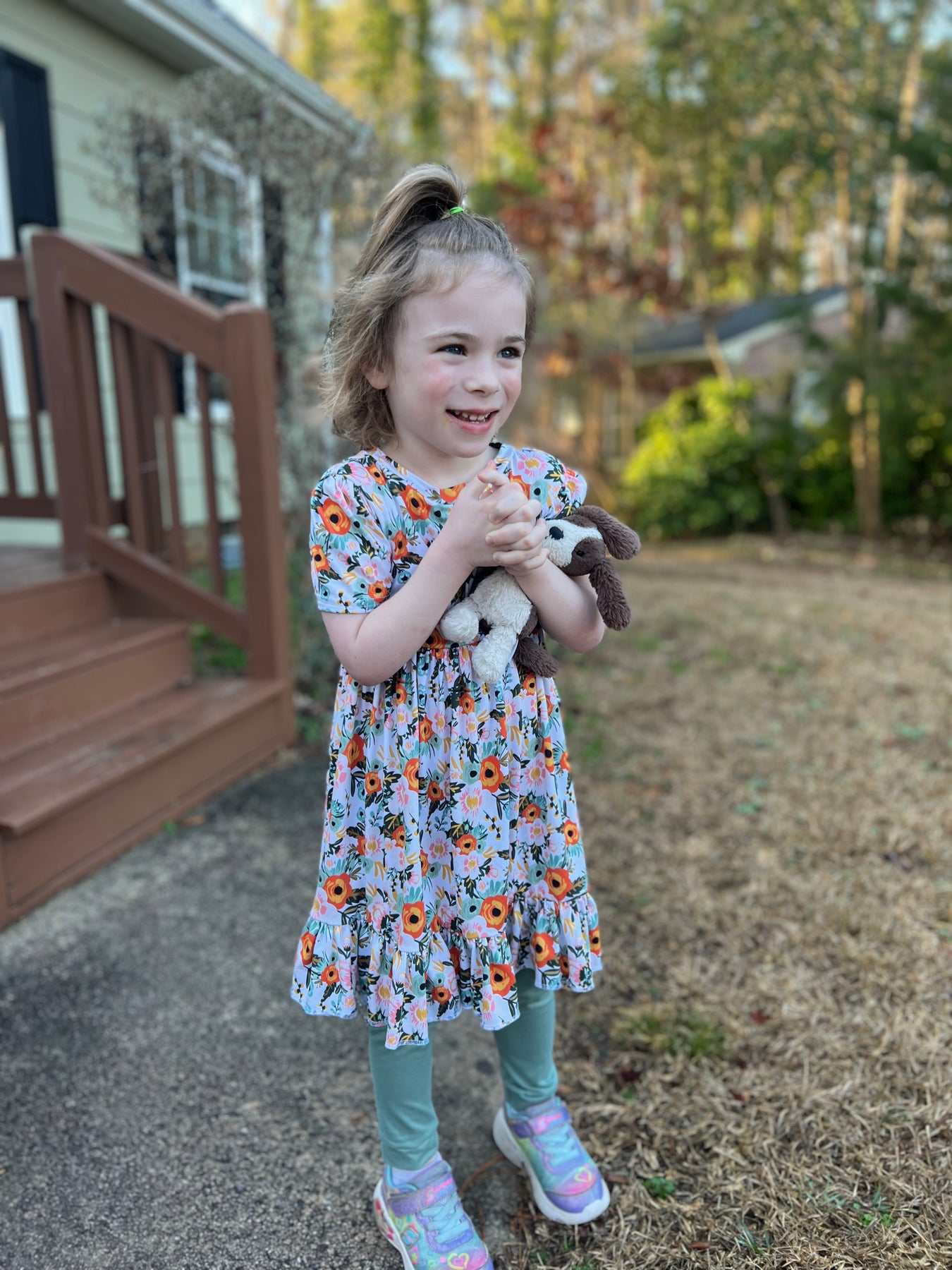 This dress features a vibrant print, or solid, on our buttery soft & stretchy polyester, which provides comfort but also holds up to toddler play and washing. With this flutter sleeve dress, even the most active little ones will be able to move and grow comfortably in their new favorite twirlable dress.
