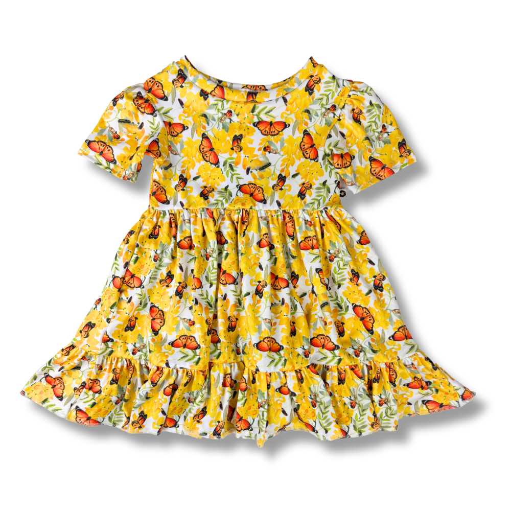 This dress features our buttery soft & stretchy poly/spandex fabric, which provides comfort but also holds up to toddler play and washing. The ruffle on the bottom of the dress will make your little one want to twirl all day. Dress features two pockets, one on each side for storing treasures. Dress should fit at the knee for a child on the smaller of the size range & above the knee for a child at the top of the range. Twirls can be pair well with our cartwheel shorts.