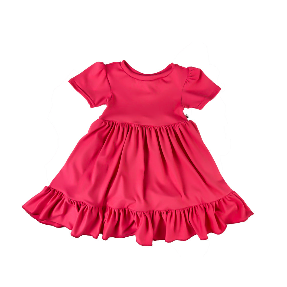 This dress features our buttery soft & stretchy poly/spandex fabric, which provides comfort but also holds up to toddler play and washing. The ruffle on the bottom of the dress will make your little one want to twirl all day. Dress features two pockets, one on each side for storing treasures. Dress should fit at the knee for a child on the smaller of the size range & above the knee for a child at the top of the range.  Twirls can be pair well with our cartwheel shorts.