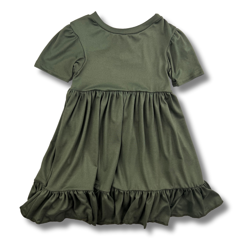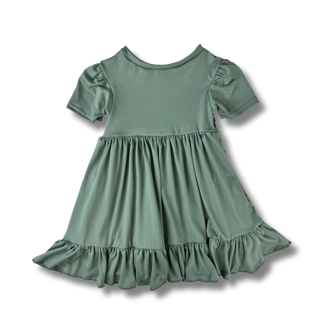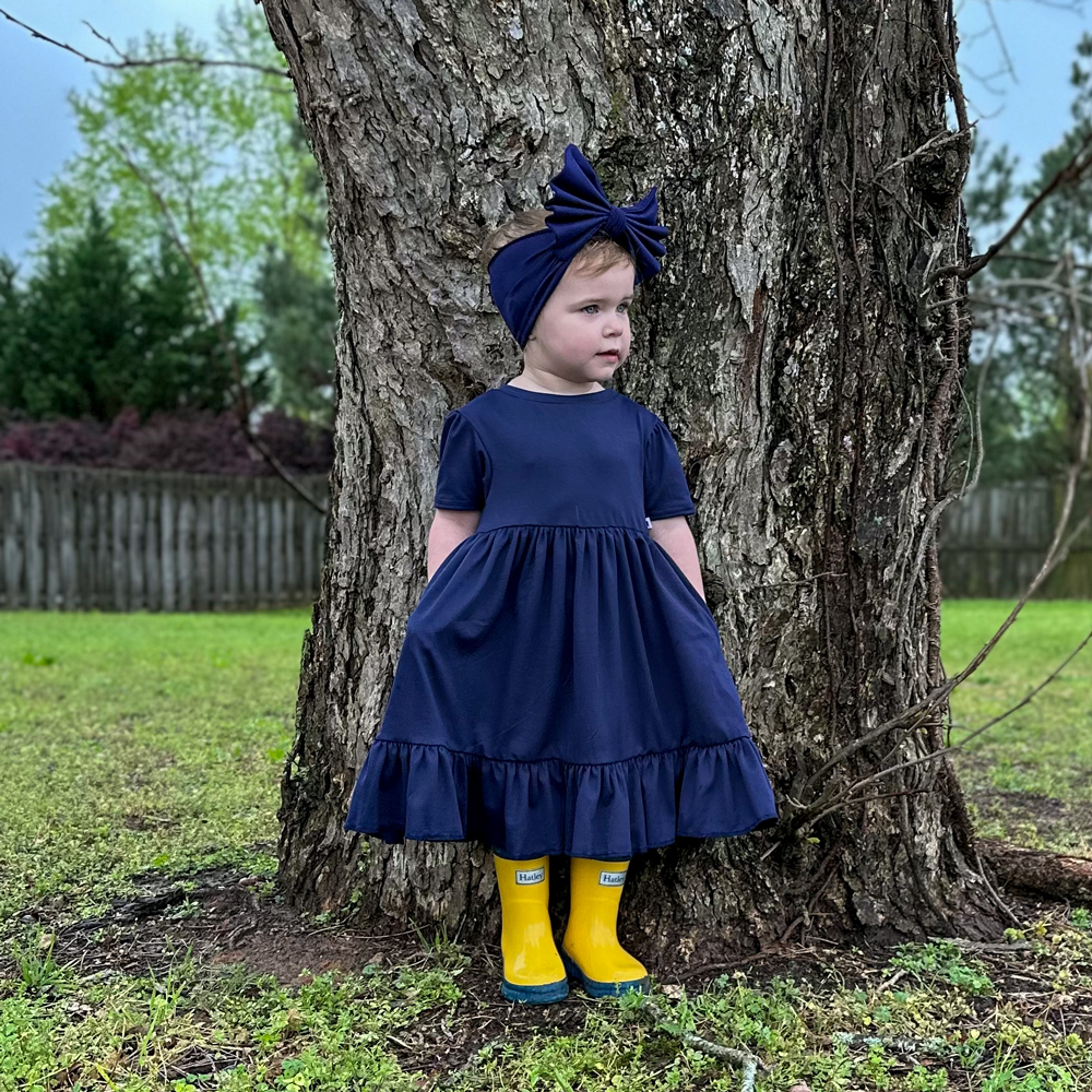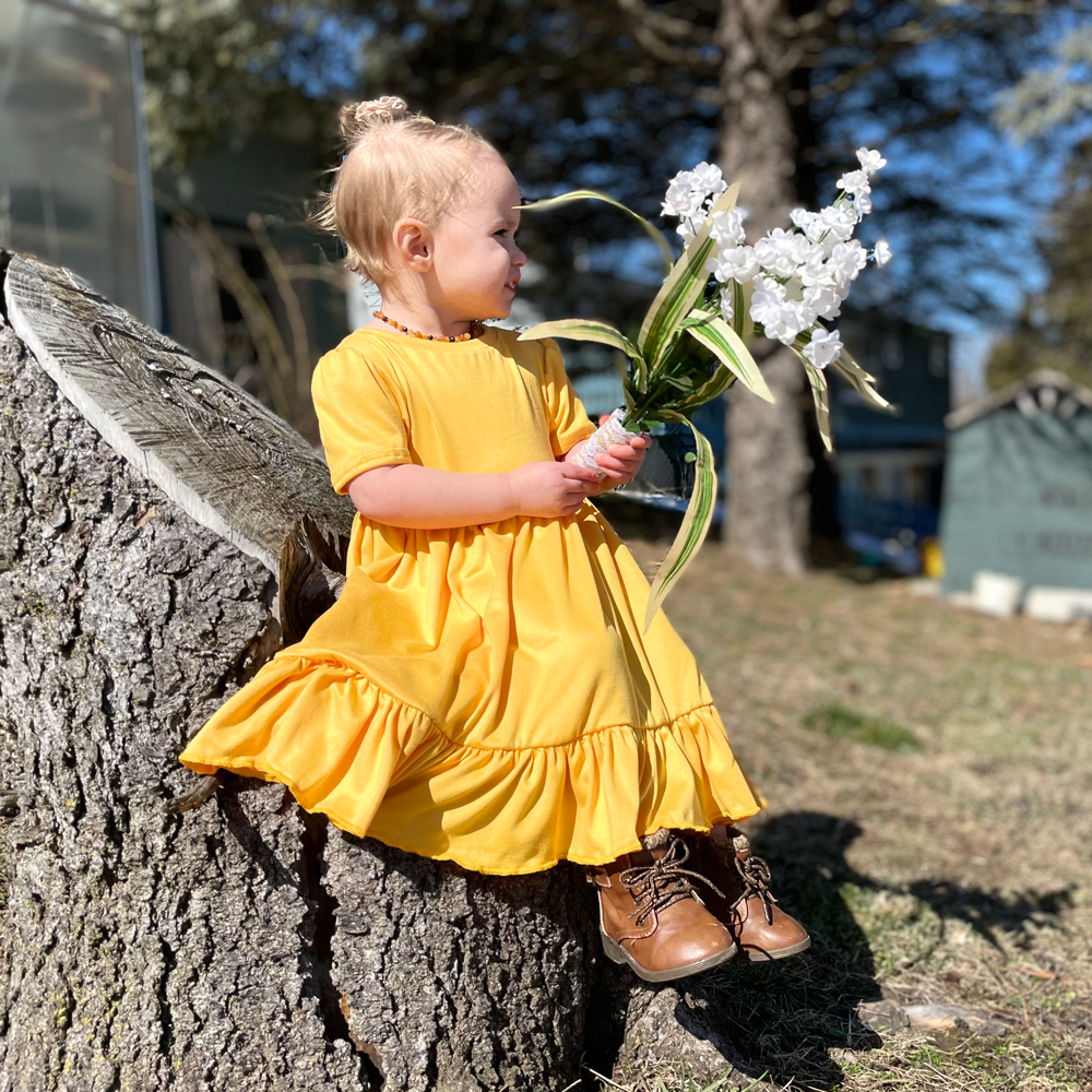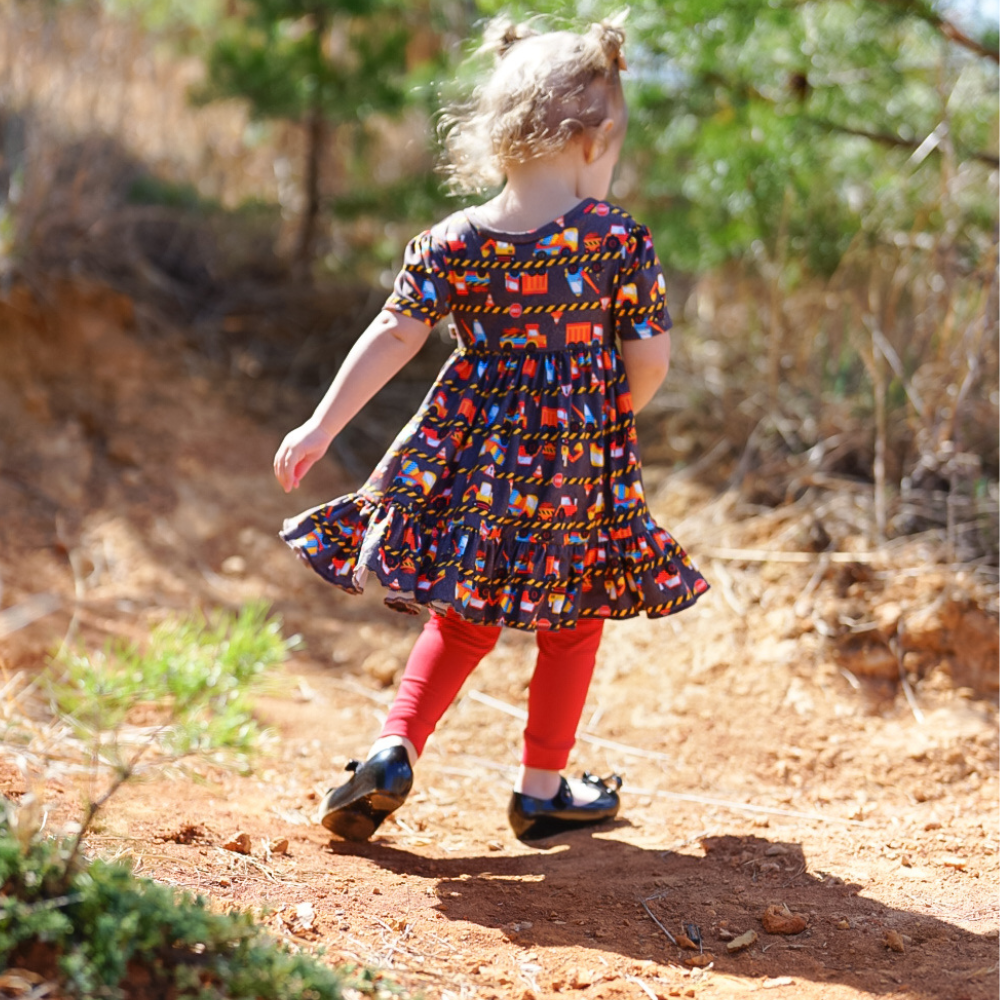 This dress features our buttery soft & stretchy poly/spandex fabric, which provides comfort but also holds up to toddler play and washing. The ruffle on the bottom of the dress will make your little one want to twirl all day. Dress features two pockets, one on each side for storing treasures. Dress should fit at the knee for a child on the smaller of the size range & above the knee for a child at the top of the range. Twirls can be pair well with our cartwheel shorts.