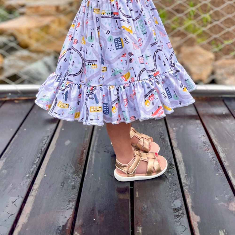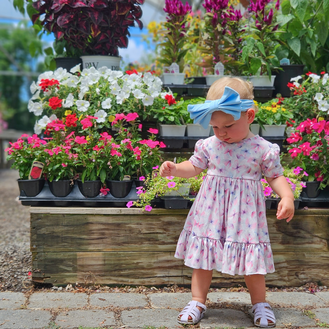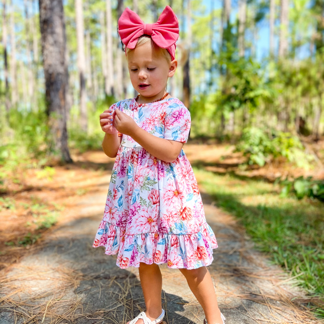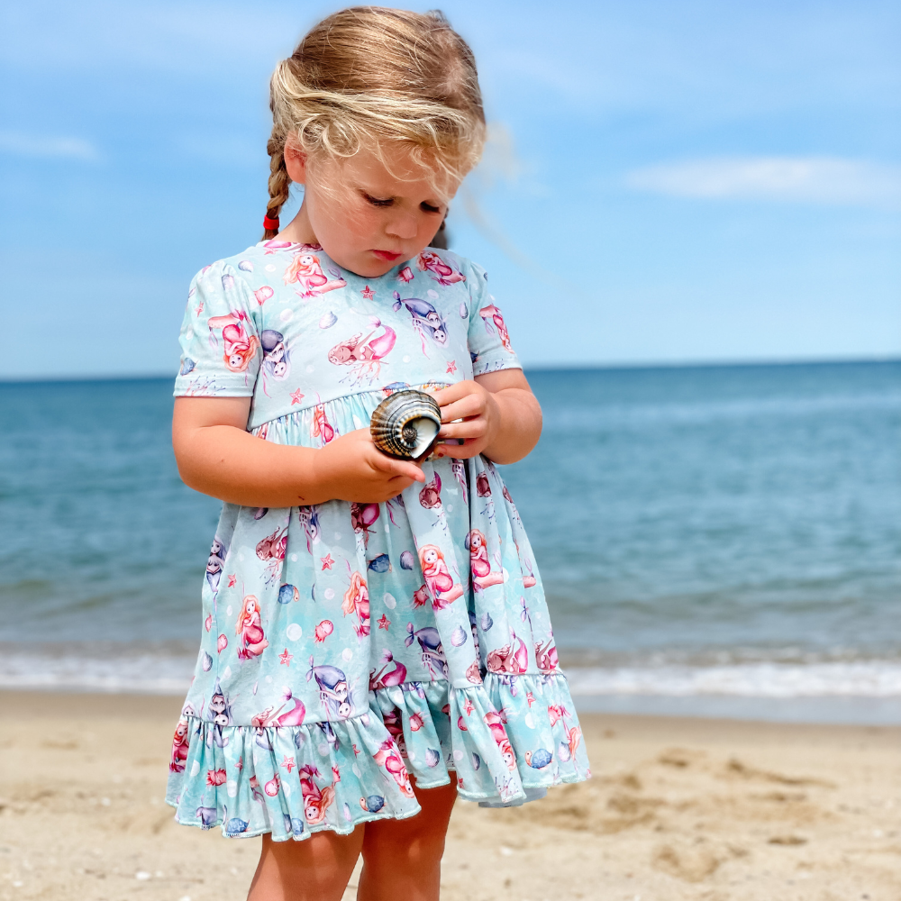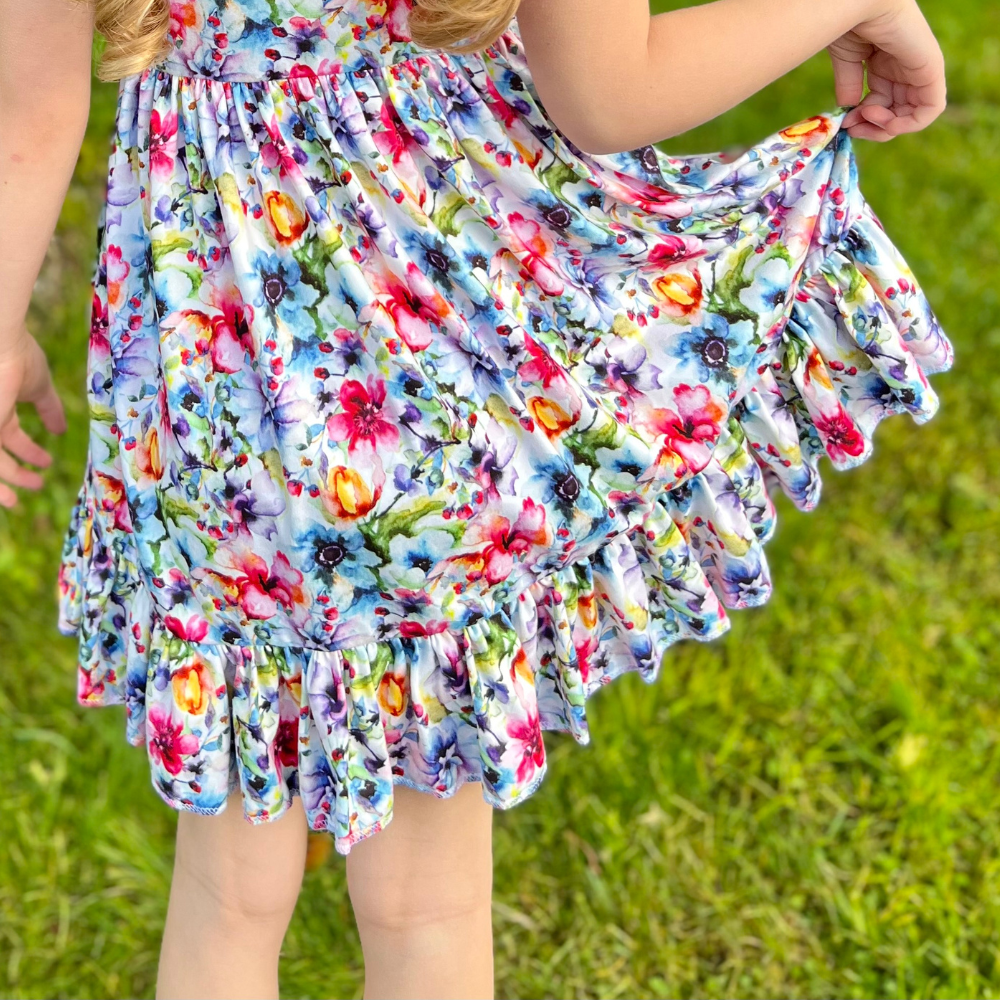 This dress features our buttery soft & stretchy poly/spandex fabric, which provides comfort but also holds up to toddler play and washing. The ruffle on the bottom of the dress will make your little one want to twirl all day. Dress features two pockets, one on each side for storing treasures. Dress should fit at the knee for a child on the smaller of the size range & above the knee for a child at the top of the range. Twirls can be pair well with our cartwheel shorts.