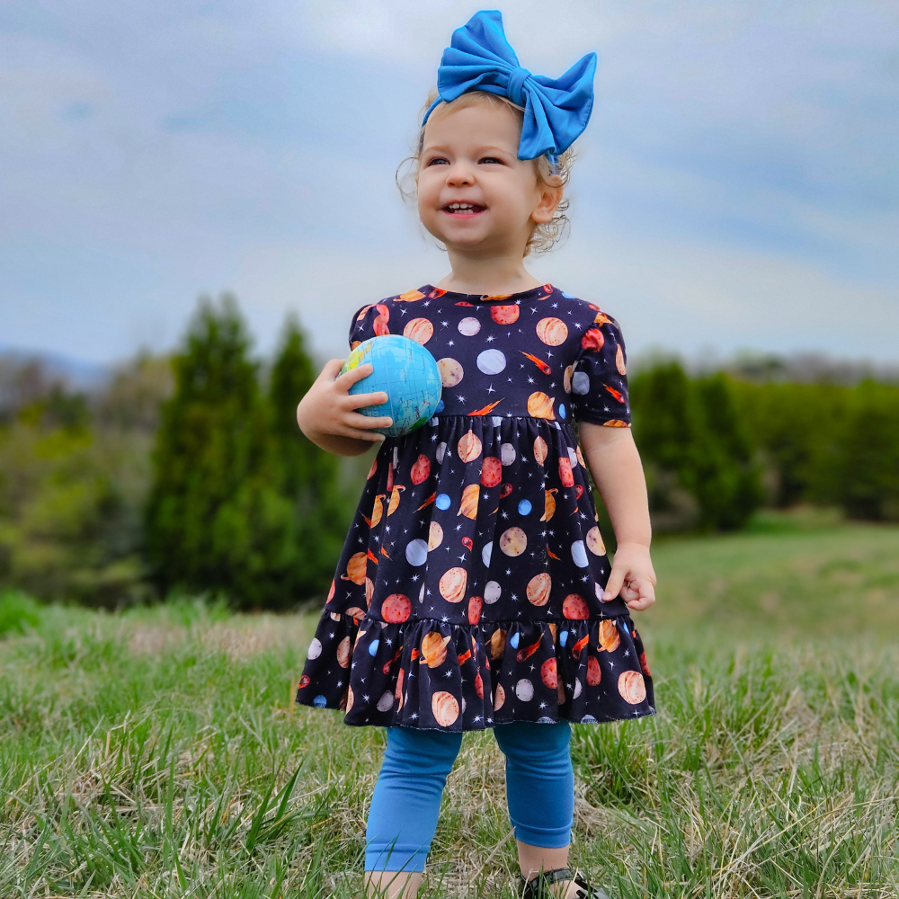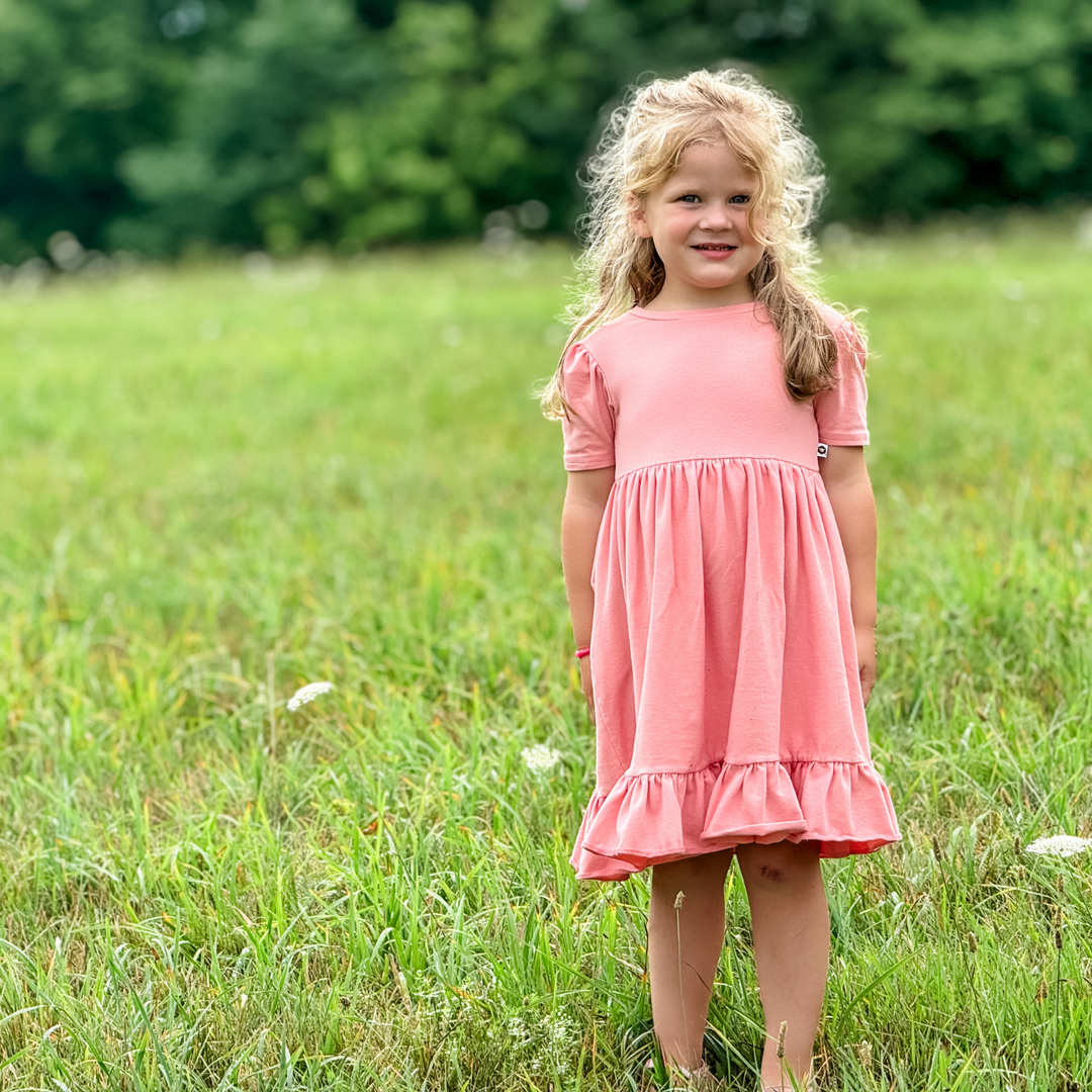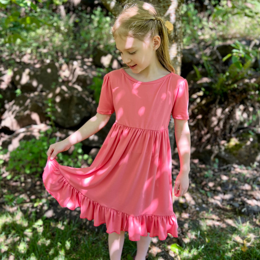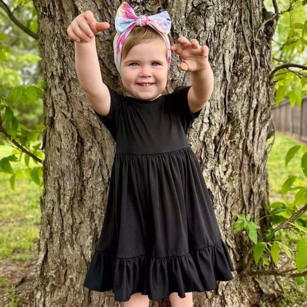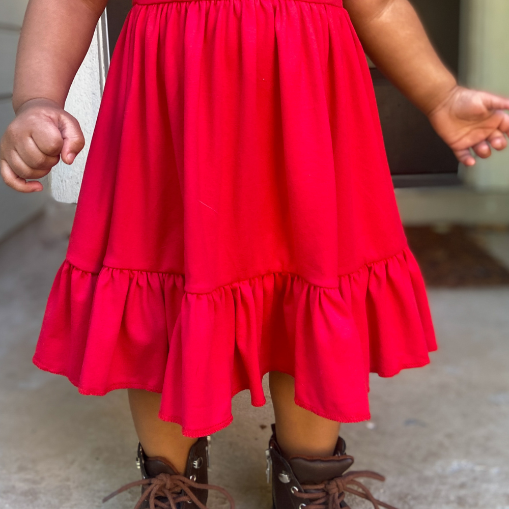 This dress features our buttery soft & stretchy poly/spandex fabric, which provides comfort but also holds up to toddler play and washing. The ruffle on the bottom of the dress will make your little one want to twirl all day. Dress features two pockets, one on each side for storing treasures. Dress should fit at the knee for a child on the smaller of the size range & above the knee for a child at the top of the range. Twirls can be pair well with our cartwheel shorts.