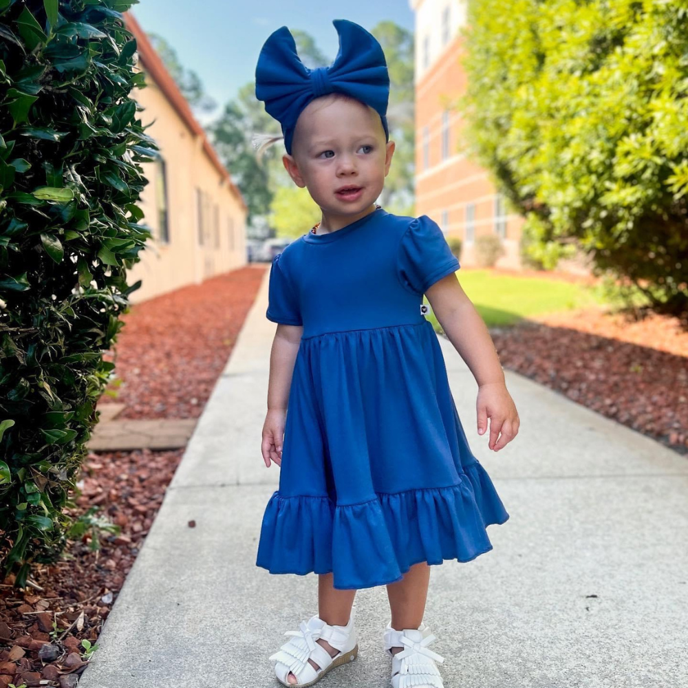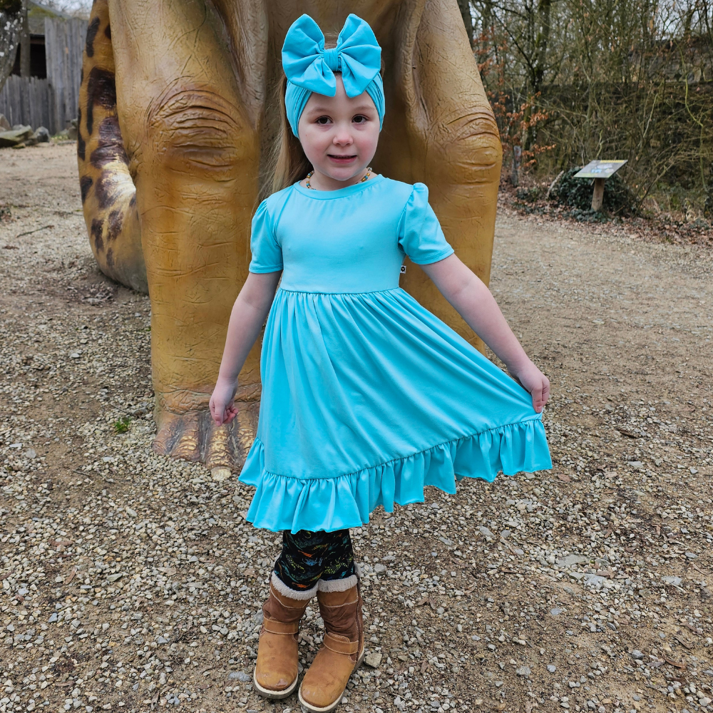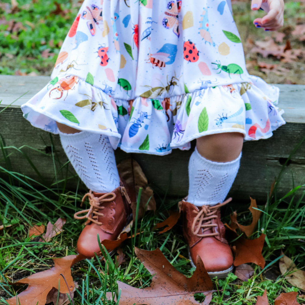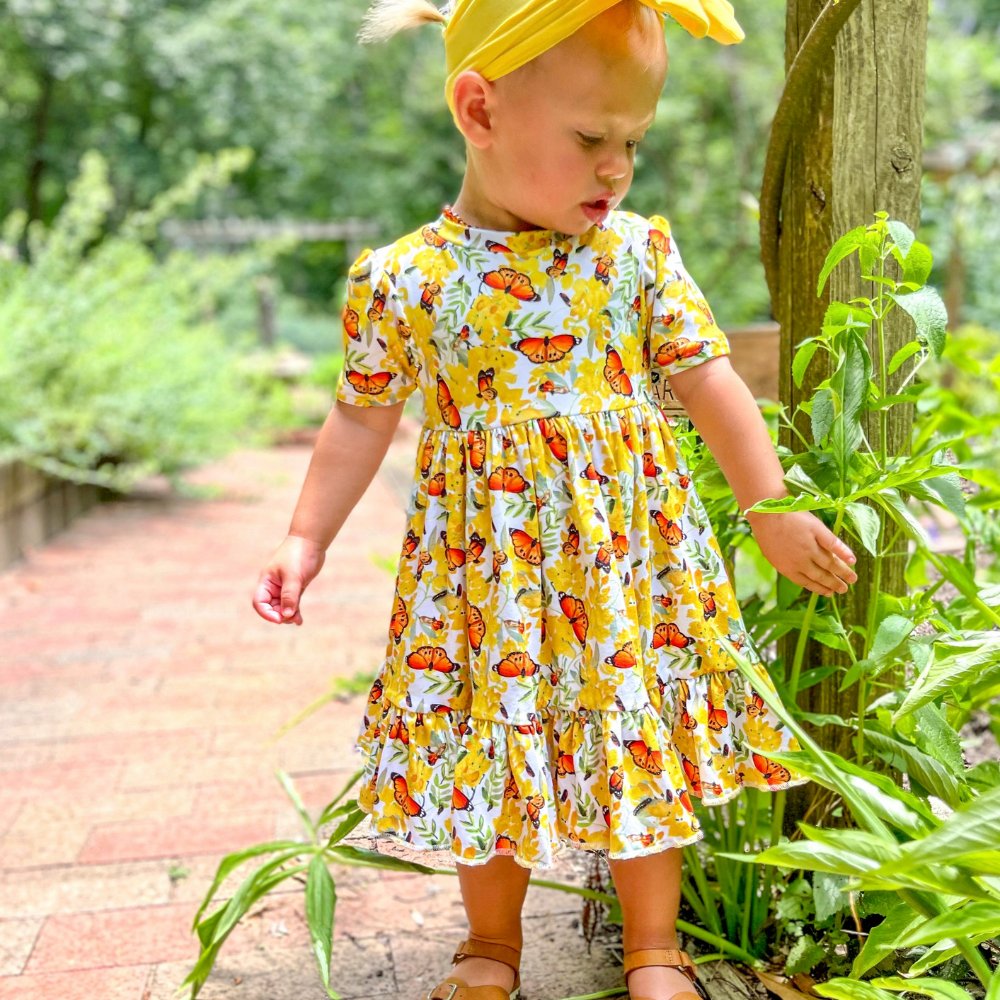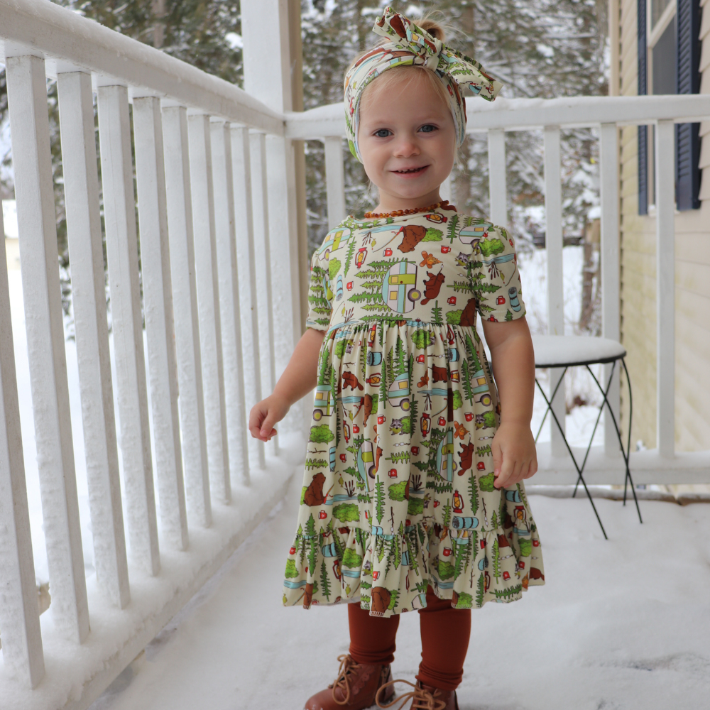 This dress features our buttery soft & stretchy poly/spandex fabric, which provides comfort but also holds up to toddler play and washing. The ruffle on the bottom of the dress will make your little one want to twirl all day. Dress features two pockets, one on each side for storing treasures. Dress should fit at the knee for a child on the smaller of the size range & above the knee for a child at the top of the range. Twirls can be pair well with our cartwheel shorts.