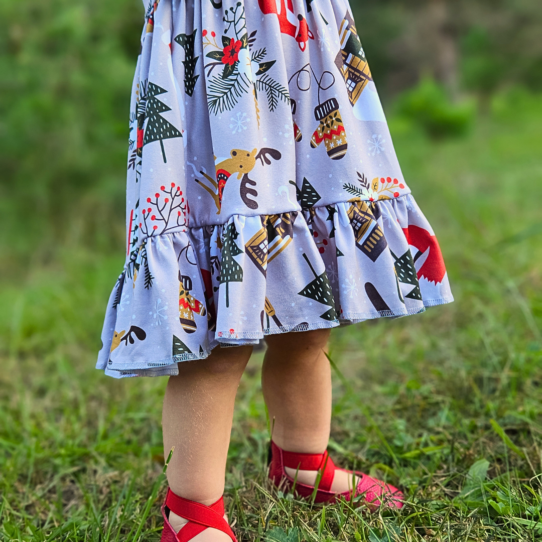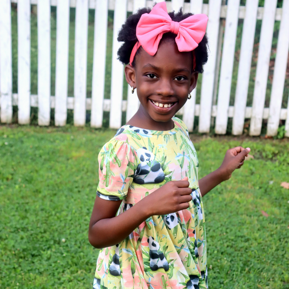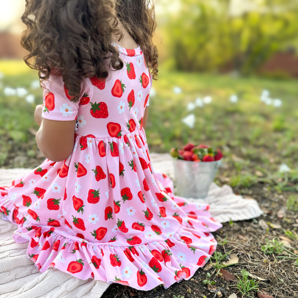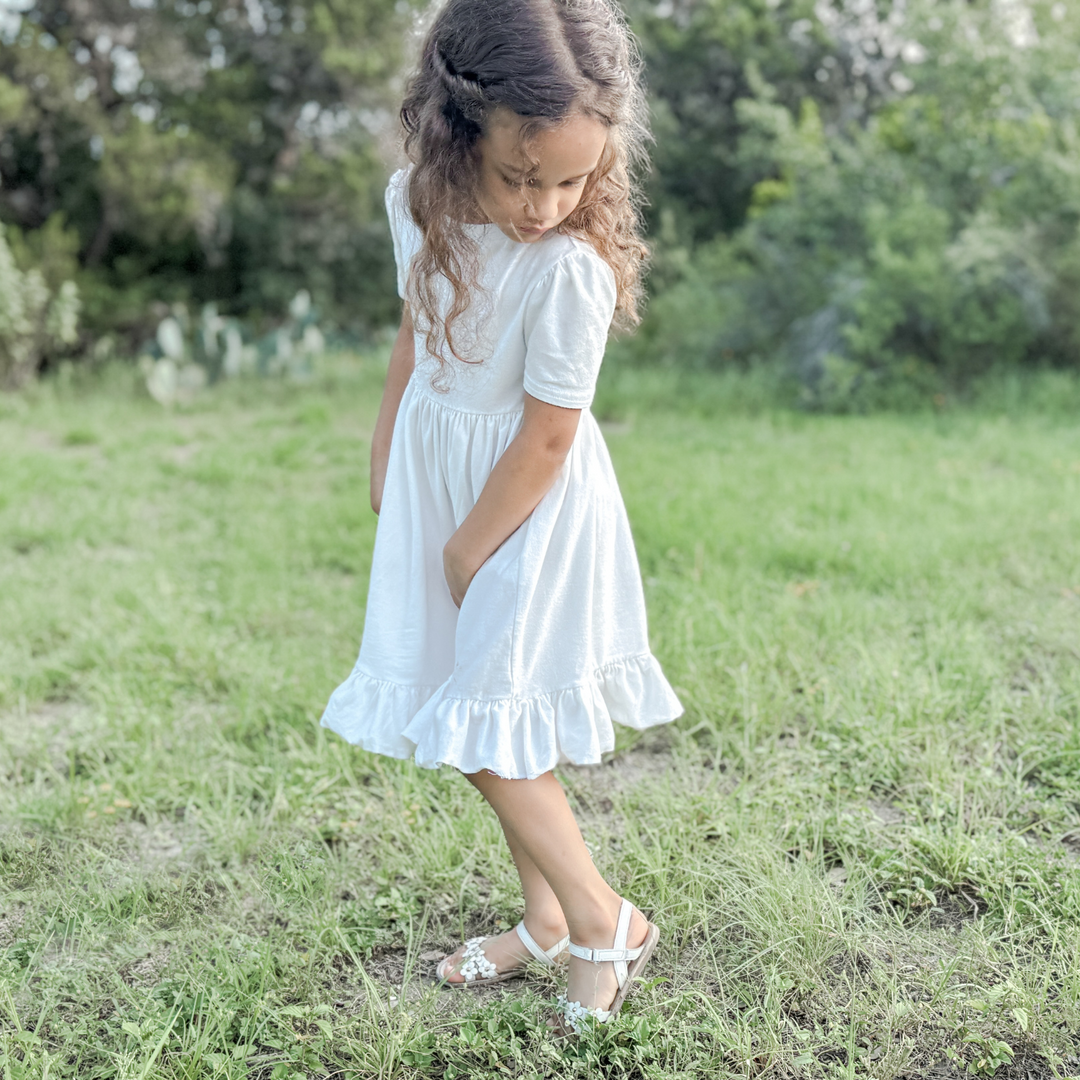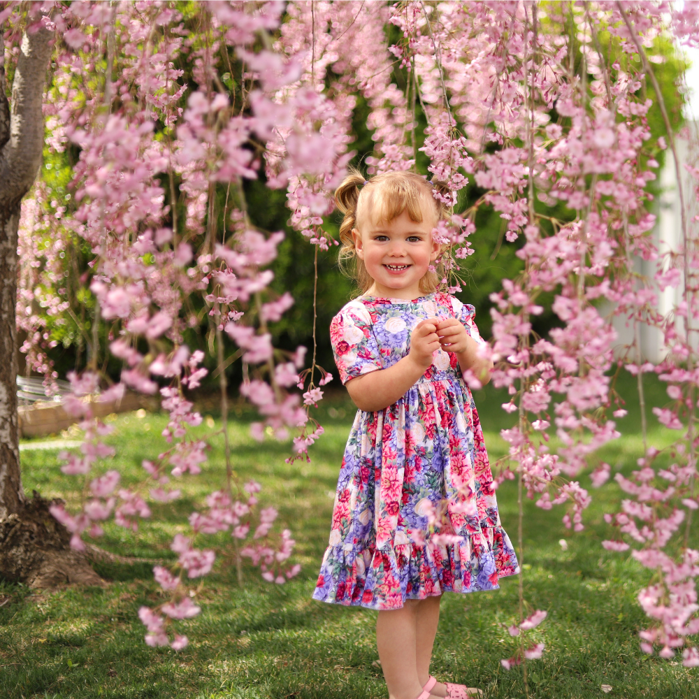 This dress features our buttery soft & stretchy poly/spandex fabric, which provides comfort but also holds up to toddler play and washing. The ruffle on the bottom of the dress will make your little one want to twirl all day. Dress features two pockets, one on each side for storing treasures. Dress should fit at the knee for a child on the smaller of the size range & above the knee for a child at the top of the range. Twirls can be pair well with our cartwheel shorts.