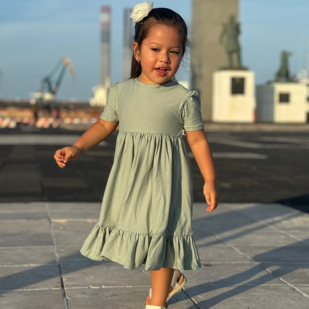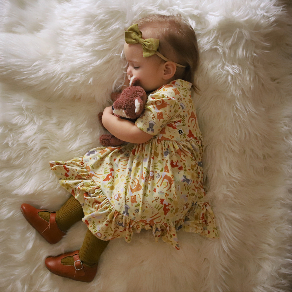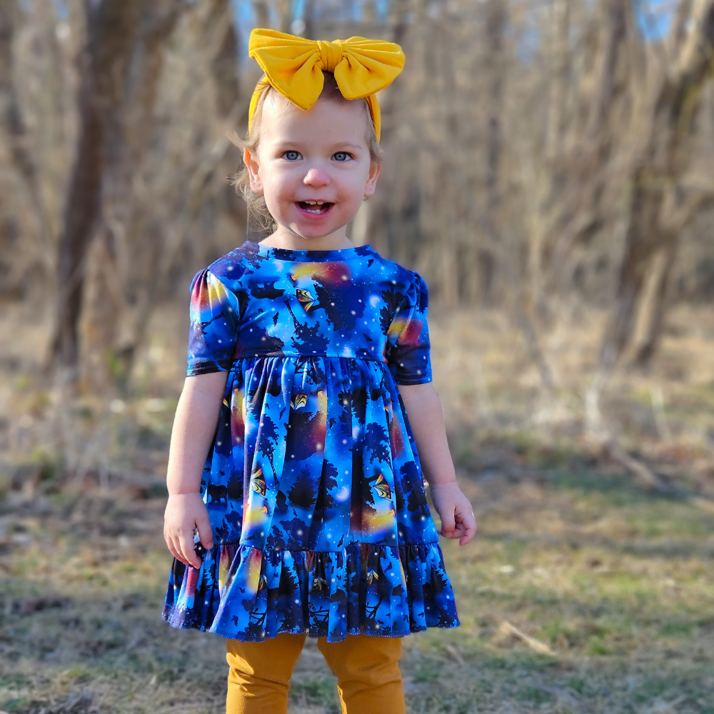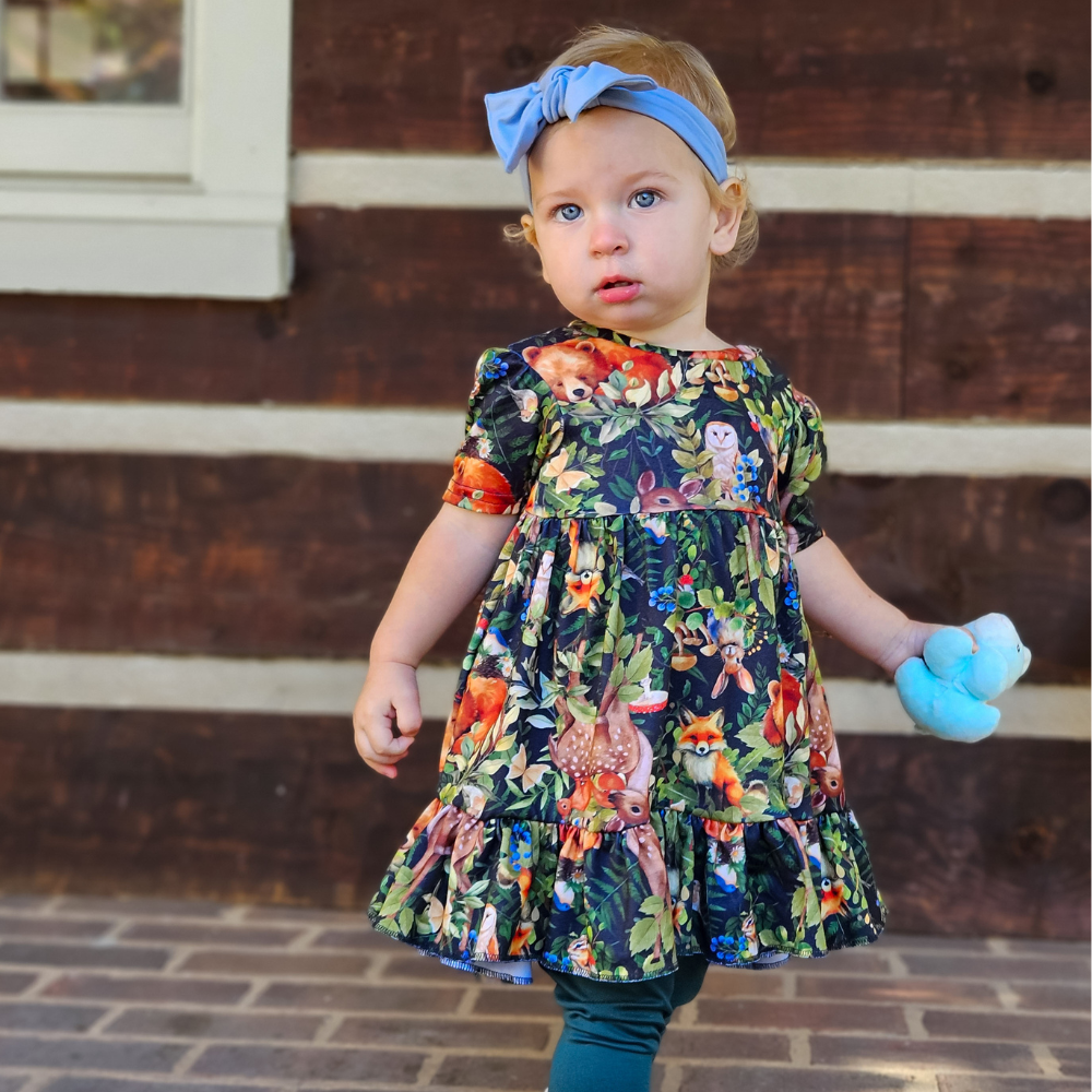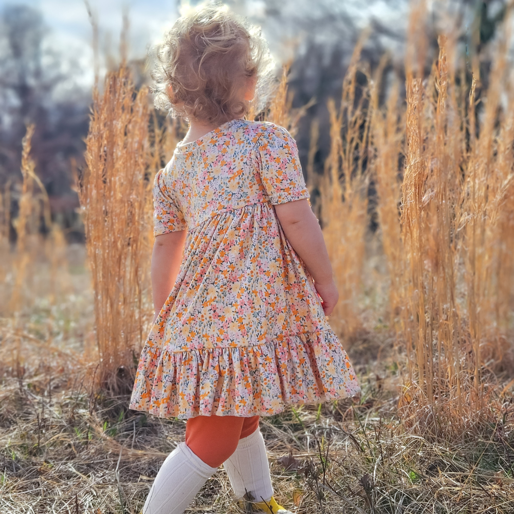 This dress features our buttery soft & stretchy poly/spandex fabric, which provides comfort but also holds up to toddler play and washing. The ruffle on the bottom of the dress will make your little one want to twirl all day. Dress features two pockets, one on each side for storing treasures. Dress should fit at the knee for a child on the smaller of the size range & above the knee for a child at the top of the range. Twirls can be pair well with our cartwheel shorts.