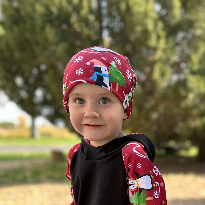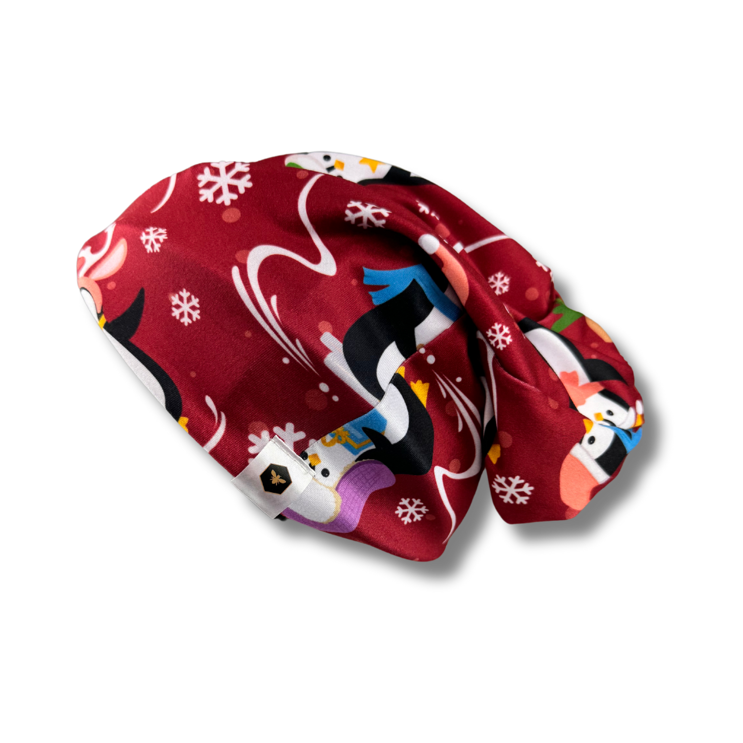 Beanies may be machine dried on low or medium heat with like fabrics. Washing or drying with rough fabrics or velcro items may cause snags or pulls.